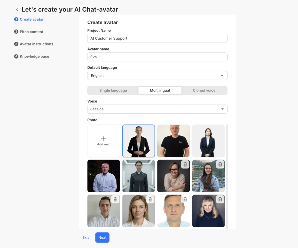 On the first screen, set the basic parameters: enter your avatar’s name, select voice and language, then take a photo or use one from Avatar library.
