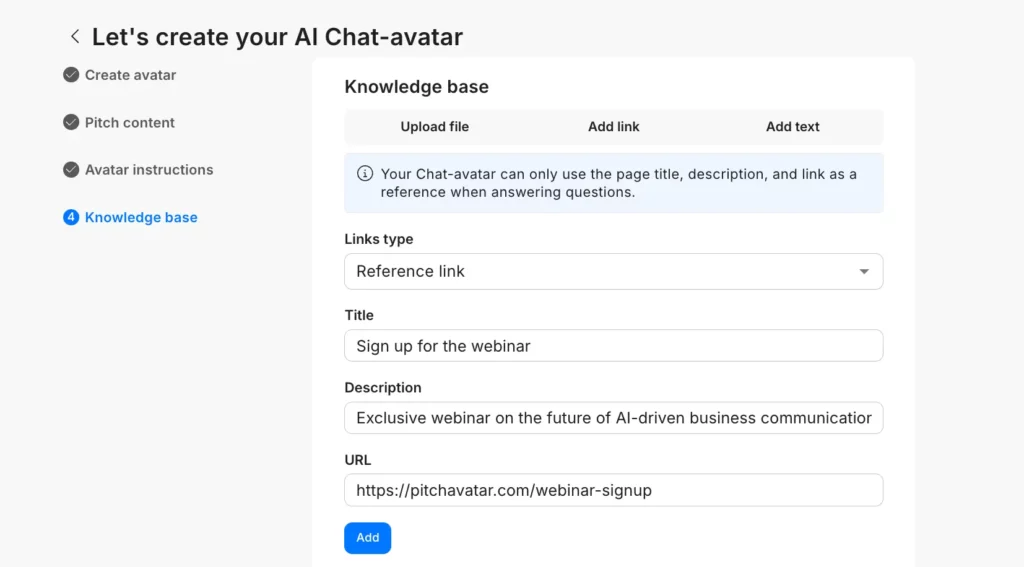 On the fourth screen, teach your avatar what it needs to know. Add any information you want it to use when assisting people: