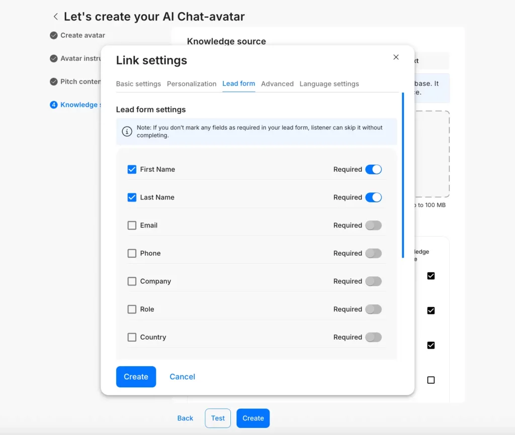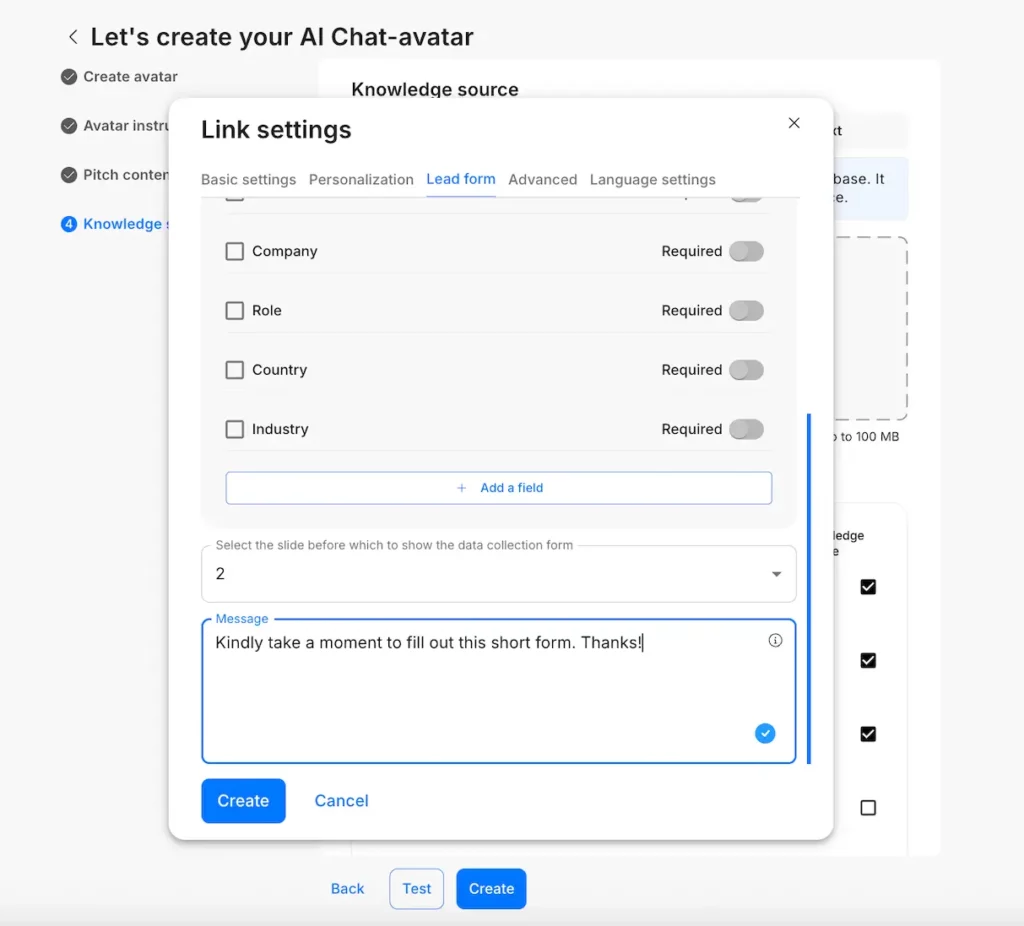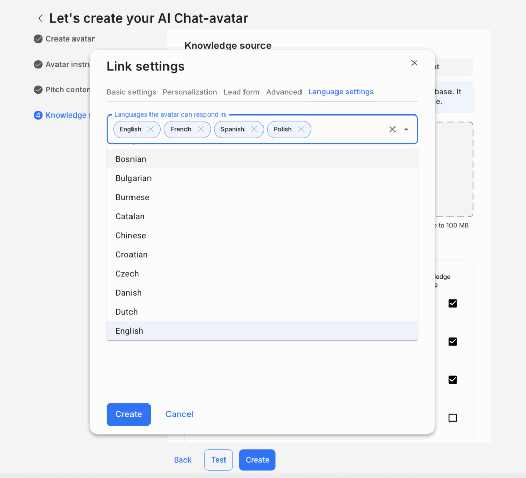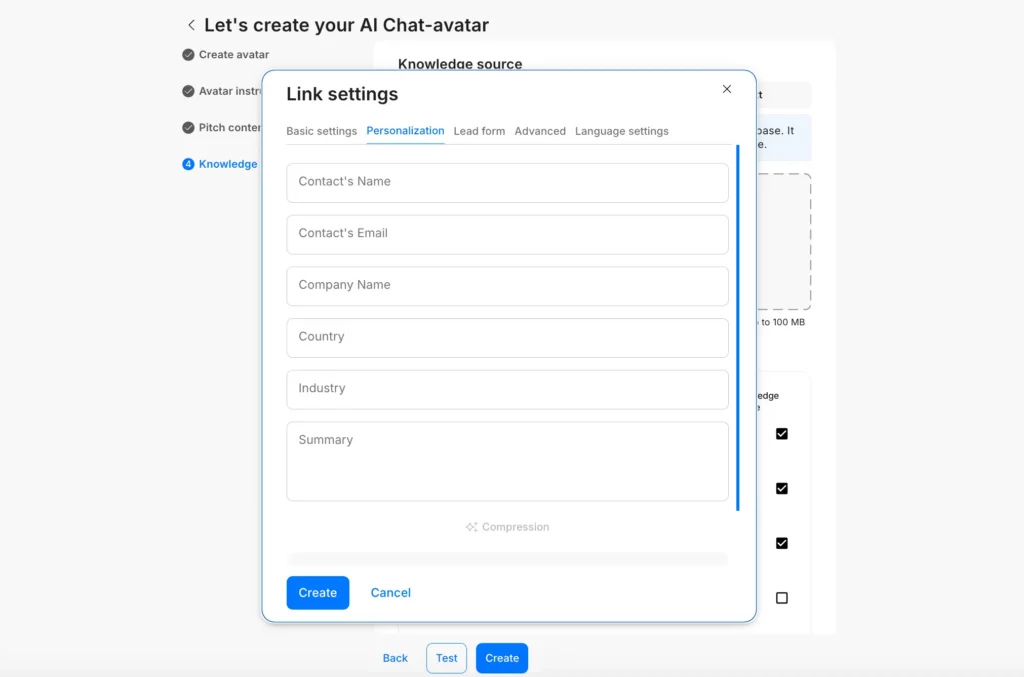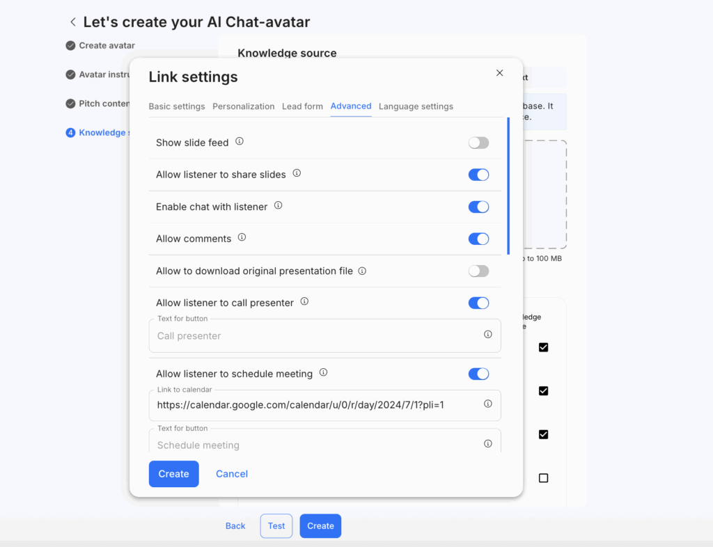 After you complete step 4 of the Chat-avatar creation process (Knowledge base) and click Create, the Link settings window opens.