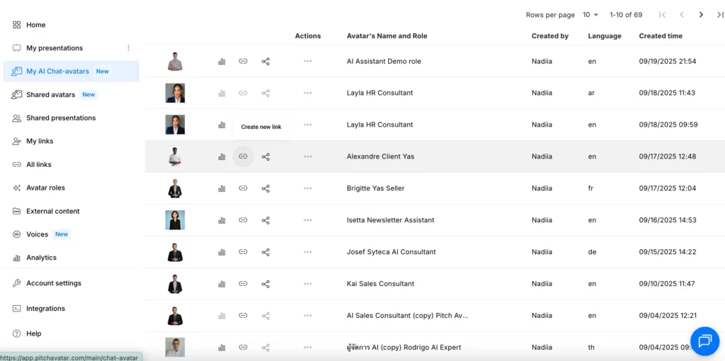 You can also generate a new link anytime from the link icon in the My AI Chat-avatars menu.