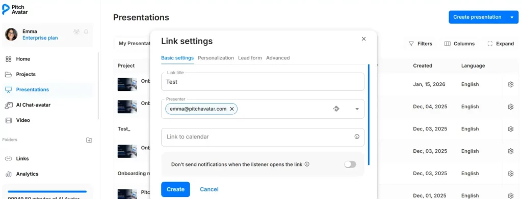 Enable or disable advanced settings for your link, such as show slide feed, enable chat with listener, allow comments, and more.