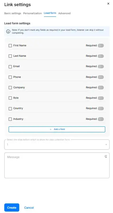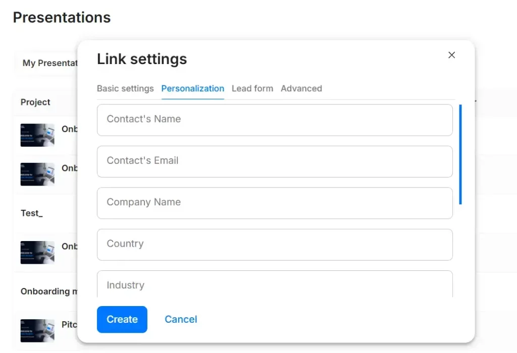 These details work together with the Lead form. To make your link fully personalized, fill in the required fields in Personalization and activate them in the Lead form. Once set up, these details will appear on the user’s screen, along with a welcome slide.