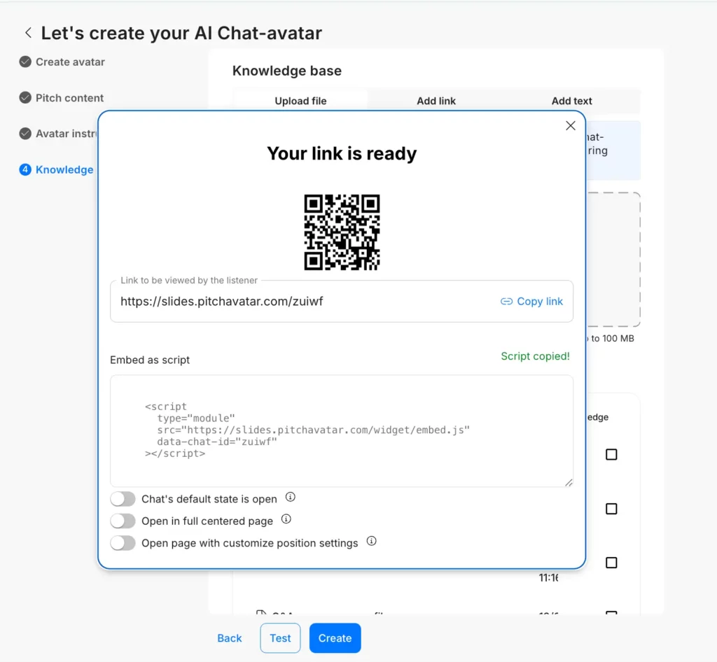 Follow the steps for creating an AI Chat-avatar except for Screen 2: Pitch Content https://pitchavatar.com/knowledge-base/ai-chat-avatar/