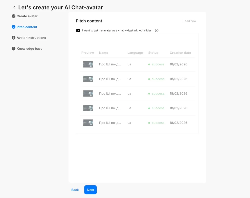 The only difference between creating a Chat-avatar with slides and a Chat-avatar as a widget is on Step 2.