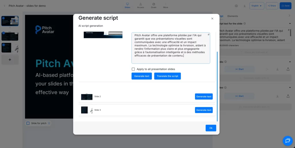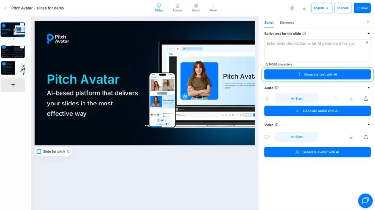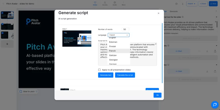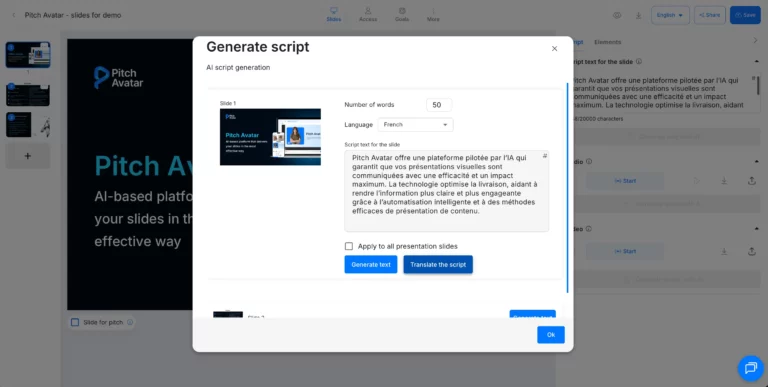In the text field, enter your prompt for the AI. For example, if you need a script for a slide about your company’s mission, type “Company mission.” You can also leave the field blank — the AI will generate a script based on the content of the selected slide.