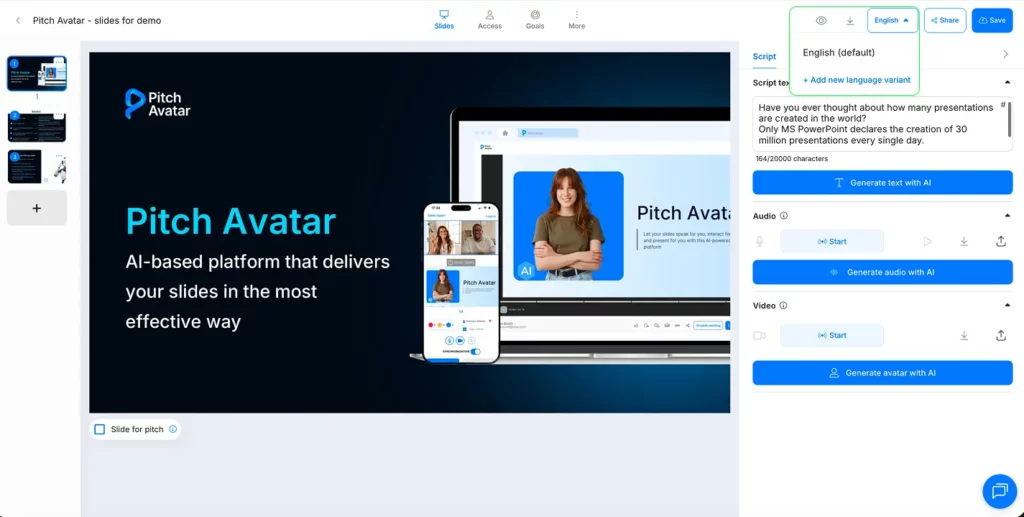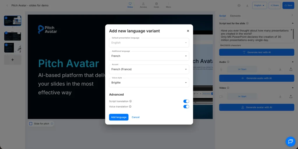 < All Topics Main Editor Mode How to translate script to presentation How to translate script to presentation UpdatedSeptember 19, 2025 After you enter your text script, you’ll see a Translate script button in the script creation window. Choose your desired language, click Translate, and save your output.